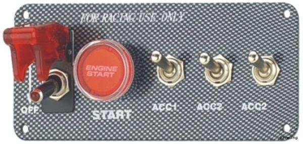 Karbonmintás kapcsolópanel indítógombbal, egy fedeles és három sima kapcsolóval.